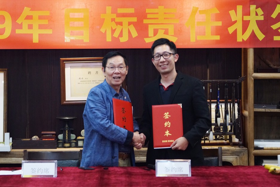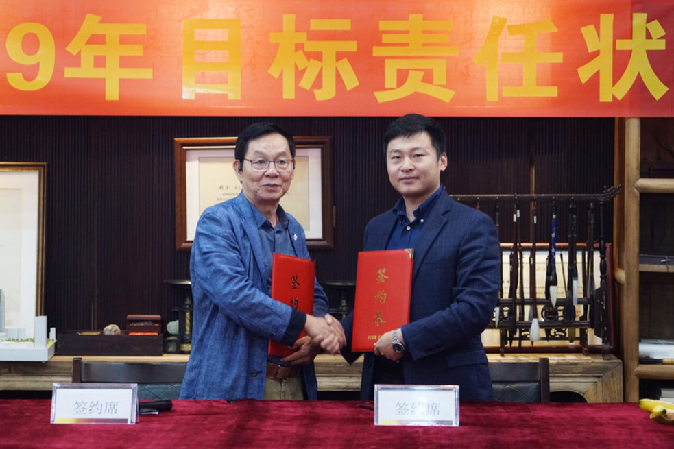董事局主席楊峰(左)與集團營銷策劃中心策劃總監王曉飛(右)簽署責任狀