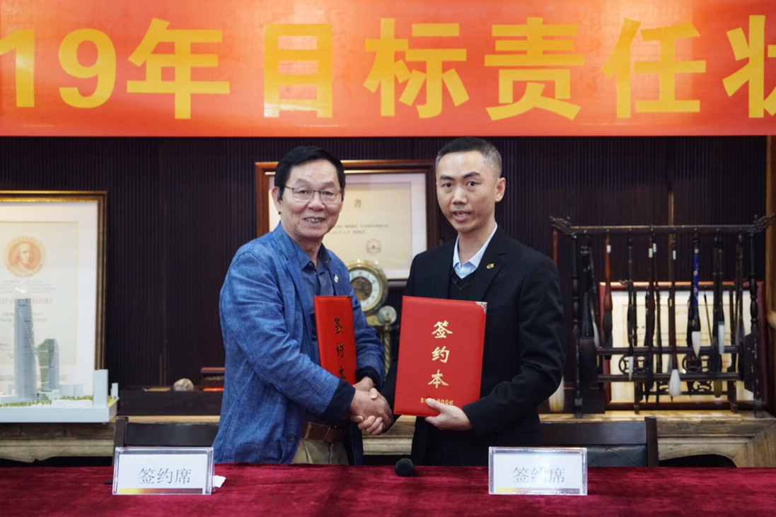董事局主席楊峰(左)與董事常務副總裁梅合理()簽署責任狀
